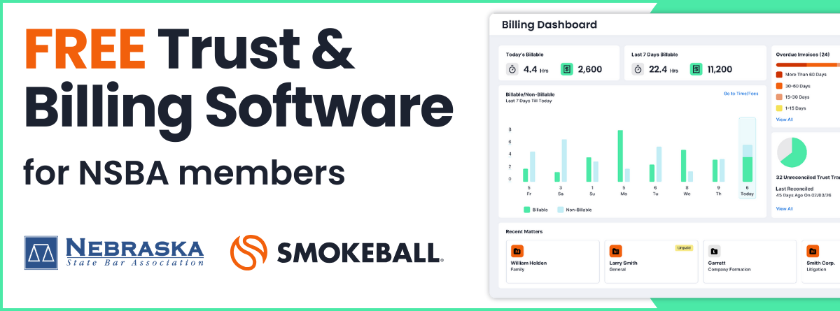 Free for members of the Nebraska State Bar Association, Smokeball Bill, trust & billing software, helps law firms manage trust accounting more compliantly, bill easily, and get paid faster.